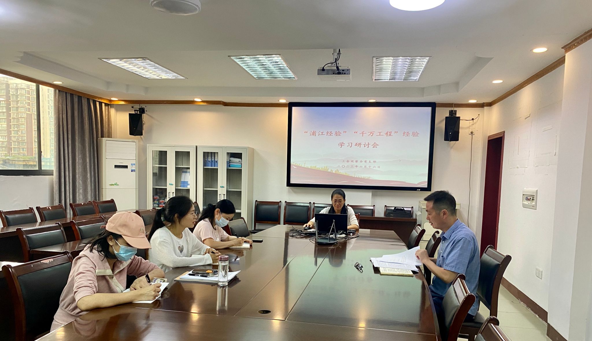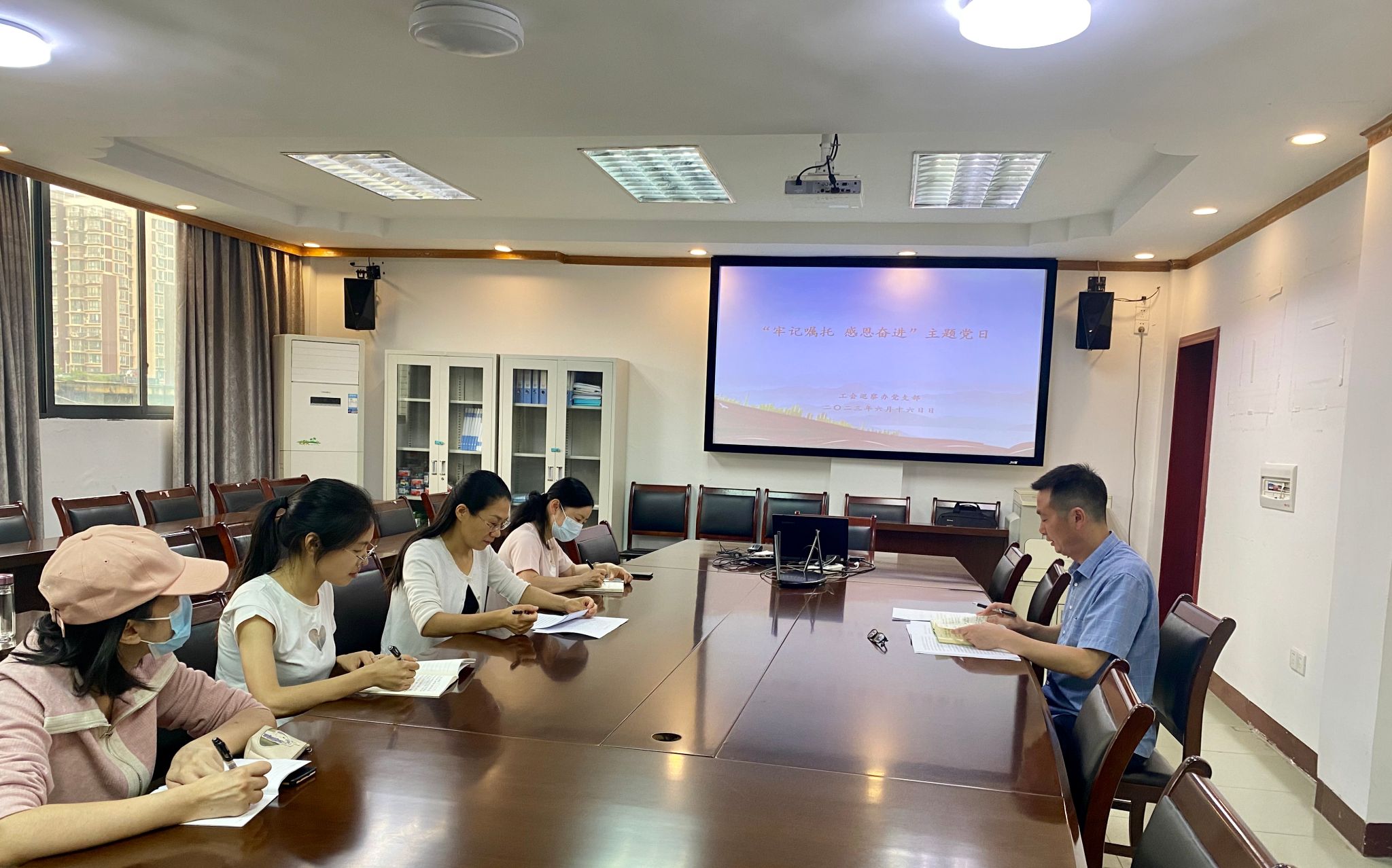 为深入学习贯彻习近平新时代中国特色社会主义思想及习近平总书记来校视察指示精神, 2023年6月16日下午,工会巡察办党支部在行政楼八楼会议室开展“牢记嘱托 感恩奋进”主题党日活动及“浦江经验”“千万工程”经验学习研讨活动,会议由党支部负责人程玉昆主持。支部全体党员参加会议。